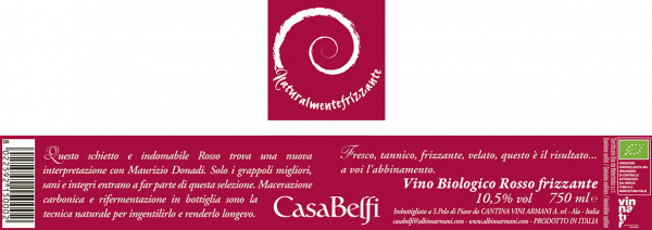 Vinification: Carbonic maceration of the whole grape for about a month. Destemming and maceration on the skins with indigenous yeasts. At the end of the fermentation the wine is racked off and stored in stainless steel tanks where it is frequently stirred in order to keep the yeasts in suspension (bâttonage). According to old tradition, in spring the wine completes the alcoholic fermentation in the bottle where residual sugars are transformed by its own yeasts into alcohol and carbon dioxide, obtaining a natural sparkling wine. After a few months in the bottle, the wine is ready to be enjoyed but can also be stored for years.