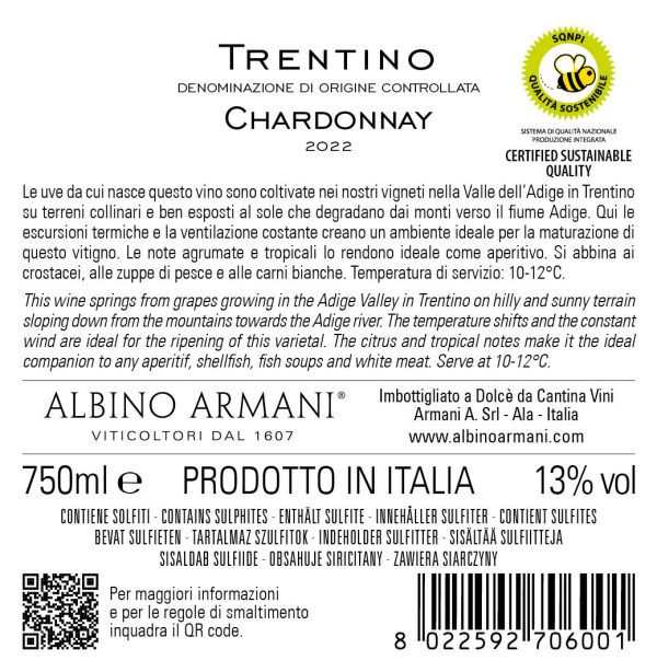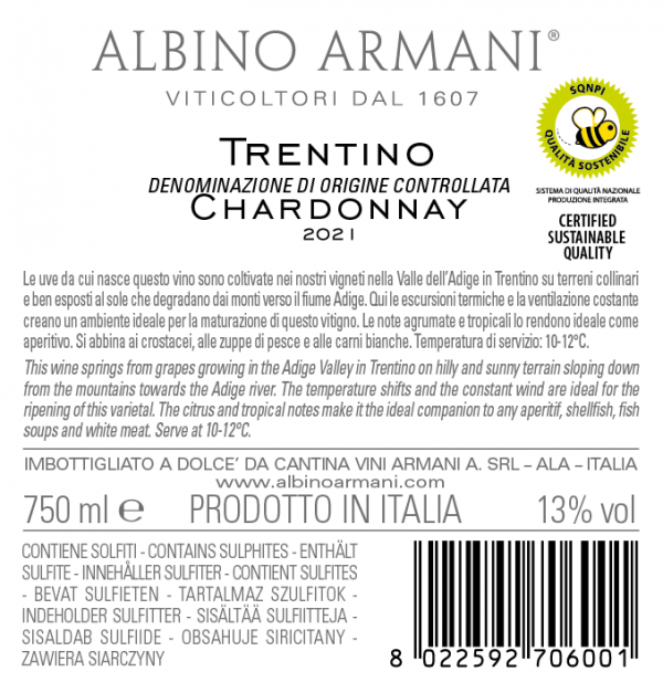 Food pairings: its wide range of aromas, makes this Chardonnay very versatile in pairings. It goes well with dishes based on white meat or fish, with medium-aged cheese and with vegetarian cuisine.
