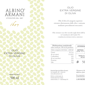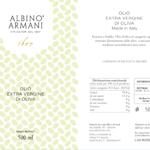 Processing: the olives are taken to the mill within the day, then milled and processed by cold extraction, in order to maintain the natural organoleptic characteristics.