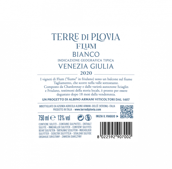Vinification: manual harvesting, when the grapes are completely ripe. Pressing of the whole bunch. The three grapes making up the blend are vinified separately in various wooden barrels of different sizes: the Chardonnay in barrique, Friulano both in oaken casks and in stainless steel tanks, and the Sciaglin in tonneaux. Then they are aged on fine lees for over 12 months, with frequent batonnage. Finally, bottle aging and consumption after at least one year.