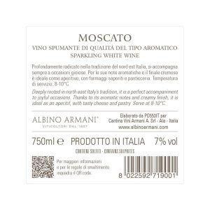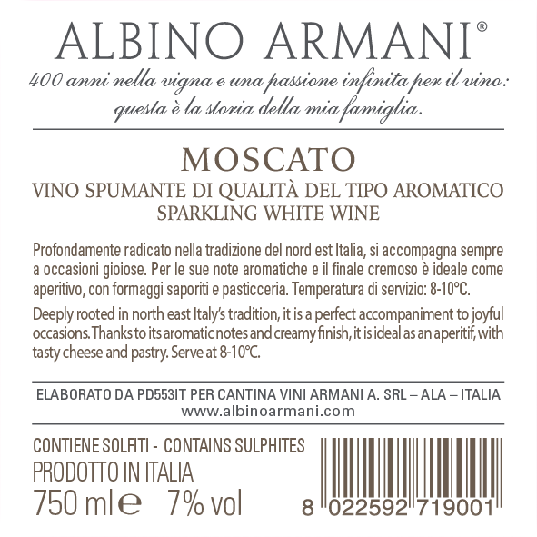 Vinification: short cold maceration on the skins to extract the aromatic substances of the Moscato grapes. Fermentation in pressure tank (Charmat method) of the must itself in order to obtain a sweet sparkling wine with a low alcohol content.