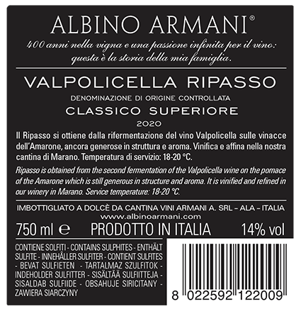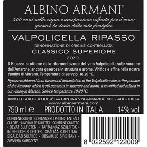 Vinification: the fresh Valpolicella wine, is poured over the Amarone pomace that, being still full of un-fermented sugars and aromatic compounds, start a second fermentation. Then punching down the cap and some “délestage” are done until the complete depletion of the sugar content, making the wine rich in structure and sweet tannins. The ageing occurs in oak barrels.